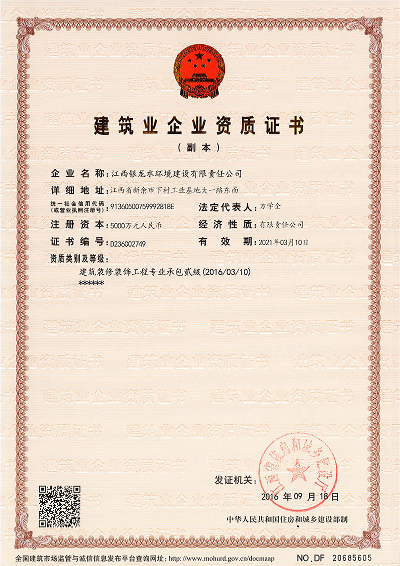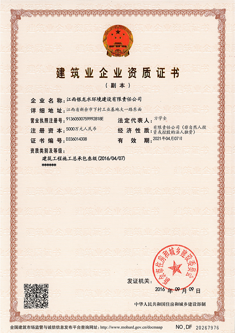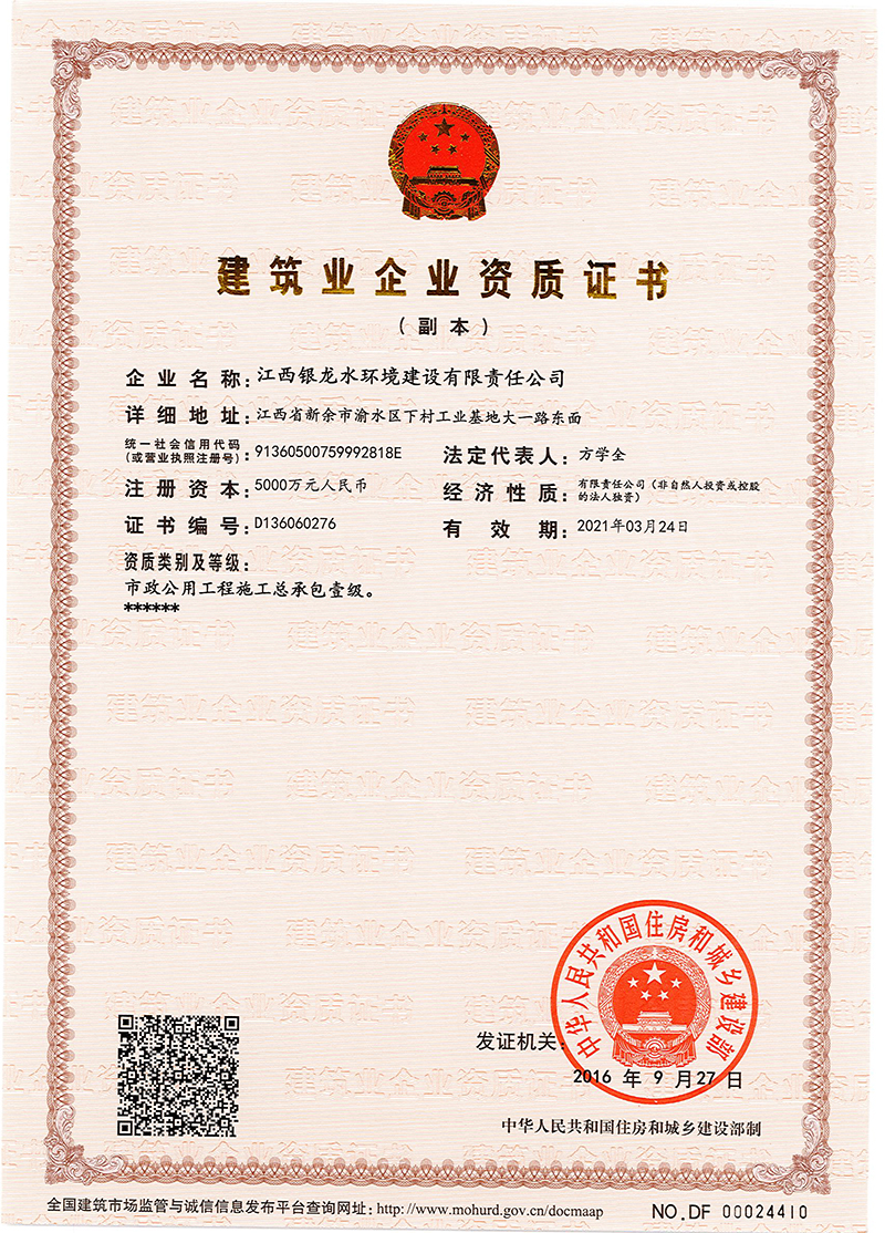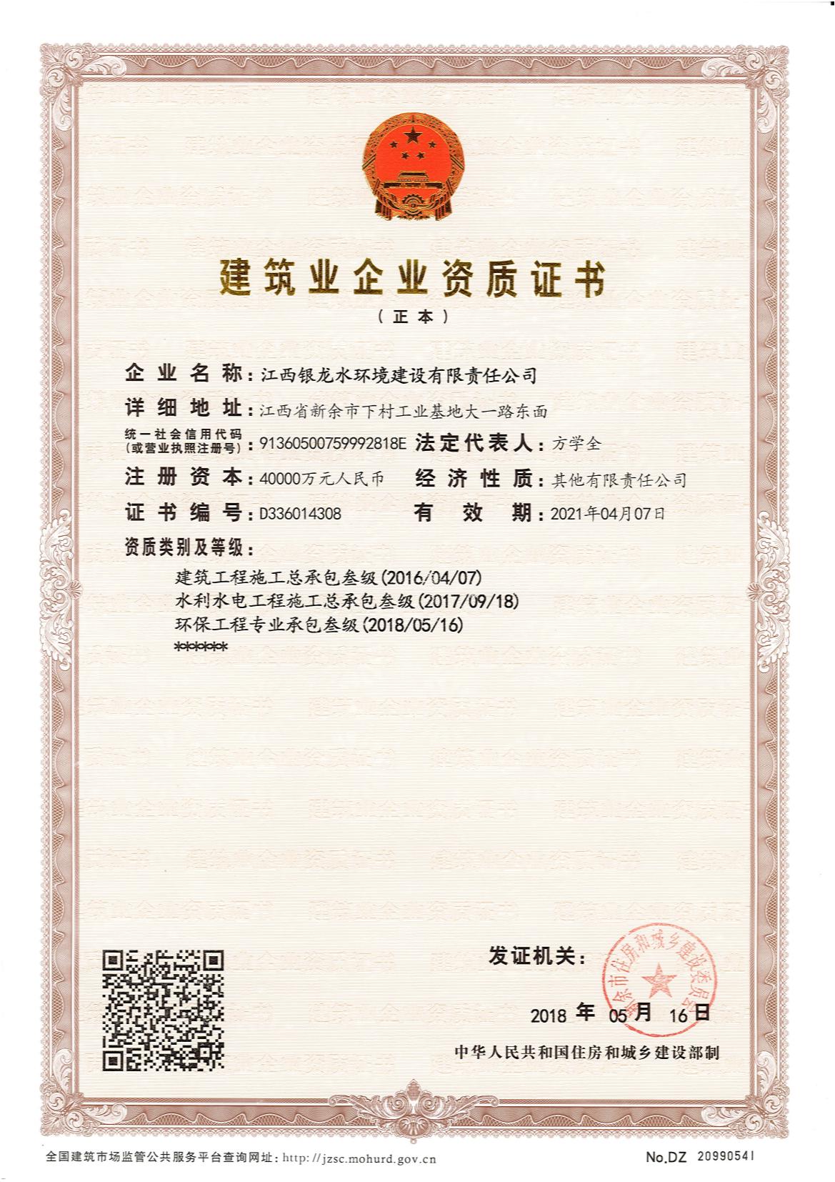 江西銀龍水環(huán)境建設(shè)有限責(zé)任公司是一家具備市政公用工程施工總承包壹級(jí)、裝飾工程專業(yè)承包貳級(jí)、屋房建筑工程施工總承包叁級(jí)資質(zhì)的大型企業(yè)集團(tuán)。公司成立于2004年,注冊資金為10億元人民幣,主要從事市政工程建設(shè),市政工程設(shè)計(jì)、咨詢,水利水電工程建設(shè),土木工程建設(shè),建筑裝飾工程,綠化工程,工程設(shè)備及材料銷售和水污染治理等業(yè)務(wù)。公司于2017年通過了ISO國際質(zhì)量、環(huán)境、職業(yè)健康與安全三個(gè)體系認(rèn)證。