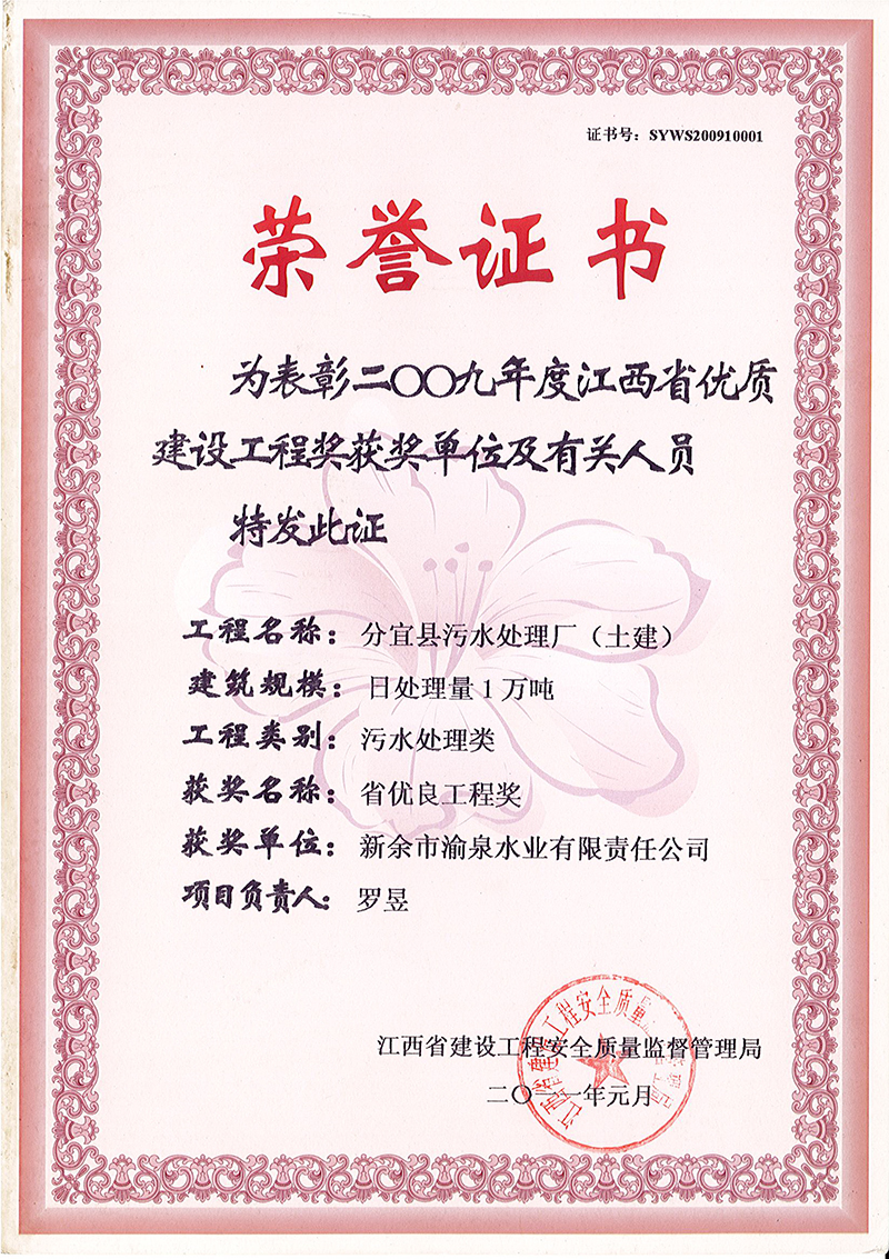 分宜縣污水處理廠獲2009年度江西省優(yōu)秀工程建設(shè)獎(jiǎng)、萬年縣污水處理廠獲2009年度江西省優(yōu)秀工程建設(shè)獎(jiǎng)