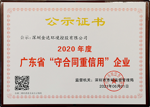 近期,深圳市市場監督管理局公示了2020年度廣東省守合同重信用企業審核結果,深圳金達環境控股有限公司憑借規范治理和誠信經營榮獲廣東省守合同重信用企業稱號。