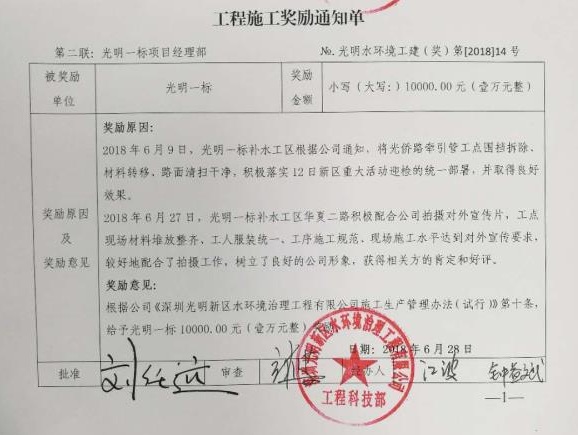 中電建水環境公司在《工程施工獎勵通知單》中指出,光明一標補水工區能夠積極落實12日光明新區重大活動迎檢的統一部署和配合宣傳工作,做好現場材料堆放整齊,工人服裝統一,工序施工規范,樹立了良好的公司形象,獲得了好評。
